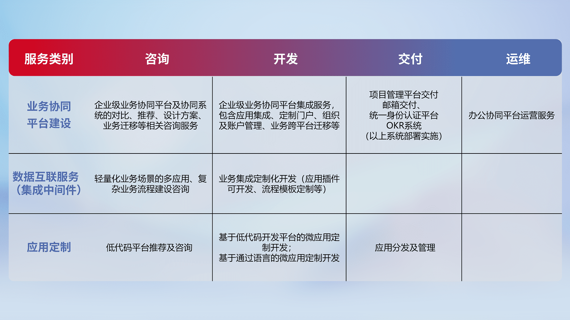 针对钉钉、、、企微、、、、IDaas等平台级产品提供产品的规划、、、、方案、、、、交付、、定制化开发等服务,,实现如统一协同办公、、智能客户服务、、混合会议管理、、智能数据查询、、、、等业务场景,,实现数字化转型。。